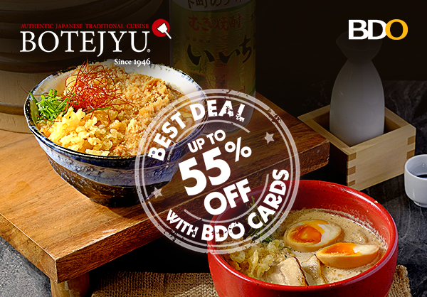 Botejyu: An authentic Japanese traditional cuisine restaurant serving a variety of dishes – from sushi and ramen to the signature okosoba or okonomiyaki. Dine in with a minimum of P3,000 and get 55% off using BDO Elite or Gold Credit Cards on BDO Pay.